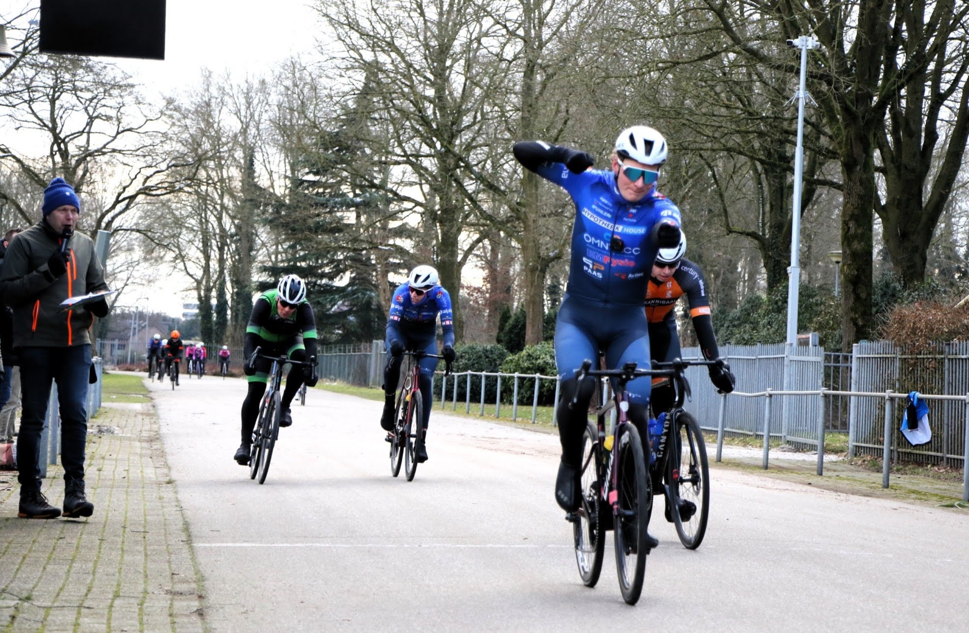 De deelnemers, 24 in totaal, hadden zich goed ingepakt en kregen alle gelegenheid om zich warm te fietsen. Het rennersveld bestond grotendeels uit amateurs en dames. Met name de dames van de Almelose Zwaluwen hadden een flinke en gewaardeerde inbreng. Zonder hun aanwezigheid zou het wel heel erg “dunnetjes” zijn geworden.
